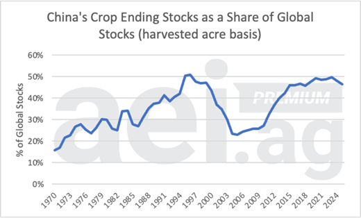 Figure 1. China’s crop ending stocks as a share of global stocks, on a harvested-acre basis, 1970 to 2025. Data source: USDA FAS and AEI.ag calculations.