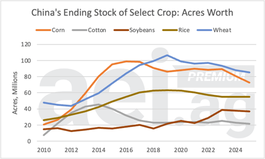 Figure 2. China’s ending stocks of select crops, acre-equivalents, 2010 to 2025. Data source: USDA FAS and AEI.ag calculations.