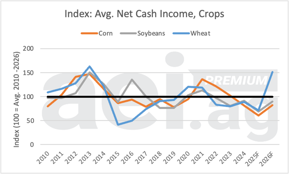 Figure 2. Index of average net cash income for select crop operations, 2010 to 2026. Data source: USDA ERA and AEI.ag calculations.