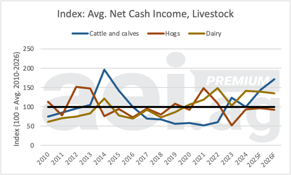 Figure 1. Index of average net cash income for select livestock operations, 2010 to 2026. Data source: USDA ERA and AEI.ag calculations.