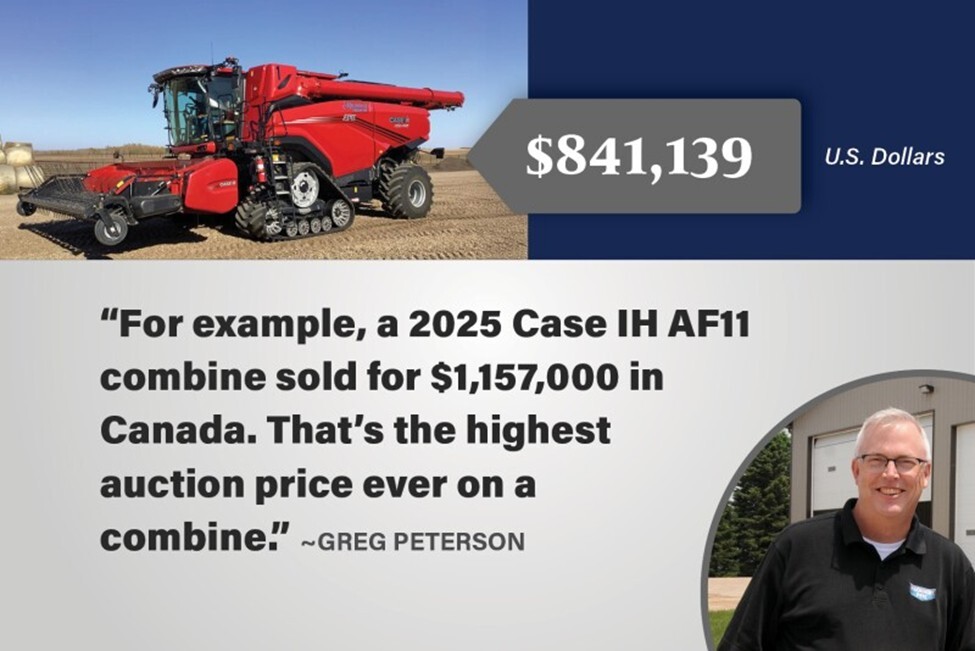 For example, a 2025 Case IH AF11 combine with 217 sep. hours and a pickup header, sold for $1,157,000 CAD on Cut Knife, SK auction on December 16, 2025. This equates to $841,139 USD. That’s the highest auction price ever on a combine.